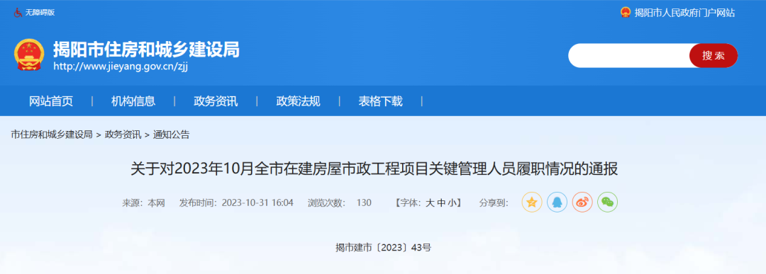 关于对2023年10月全市在建房屋市政工程项目关键管理人员履职情况的通报