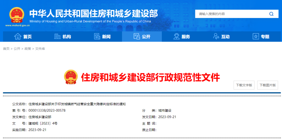 住房城乡建设部关于印发城镇燃气经营安全重大隐患判定标准的通知