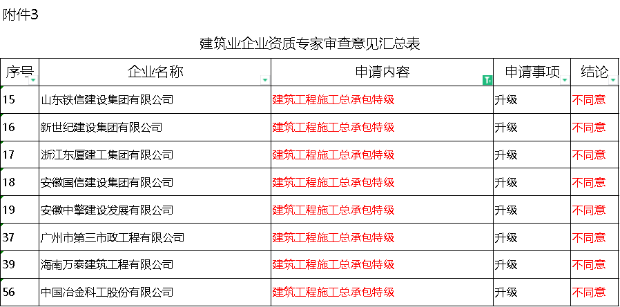 昨日,住建部官网公布最新一批《关于建设工程企业资质专家审查意见的公示》,8家企业申请建筑工程施工总承包特级,全部不通过。